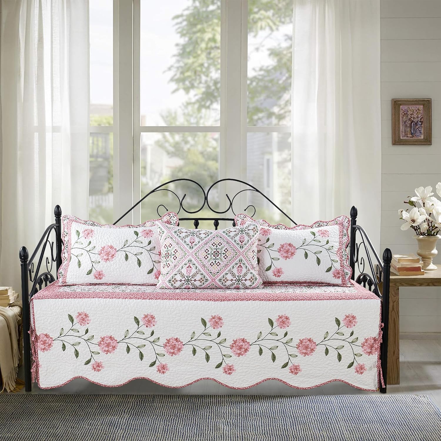 Super Soft and Lightweight: 100% Microfiber Polyester, Excellent Quality Material, naturally lightweight cover perfect for summer use or layer it on for cold weather Reversible Daybed Cover: This yellow green floral medallion printed daybed cover features an elegant and reversible florals design, adding a touch of sophistication and personality to your bedroom, effortlessly complementing various home decor styles Expert Quilting and Durable Stitching: Crafted with expert quilting techniques, quality craftsmanship, using all-over stitching, tight weave, sturdy, clean and neat. No loose threads or ravels Complete Set: 1 Daybed Cover: 75" x 39", 3 Standard Shams:20" x 26", 1 Bed Skirt: 60” x 80” + 18”, 1 Decorative Pillow: 12" x 16". It’s An ideal choice for your family and friends Care Instructions: This delicate cover set is well made so it is long lasting and easy to care for. Machine wash cold, tumble dry low. No bleach