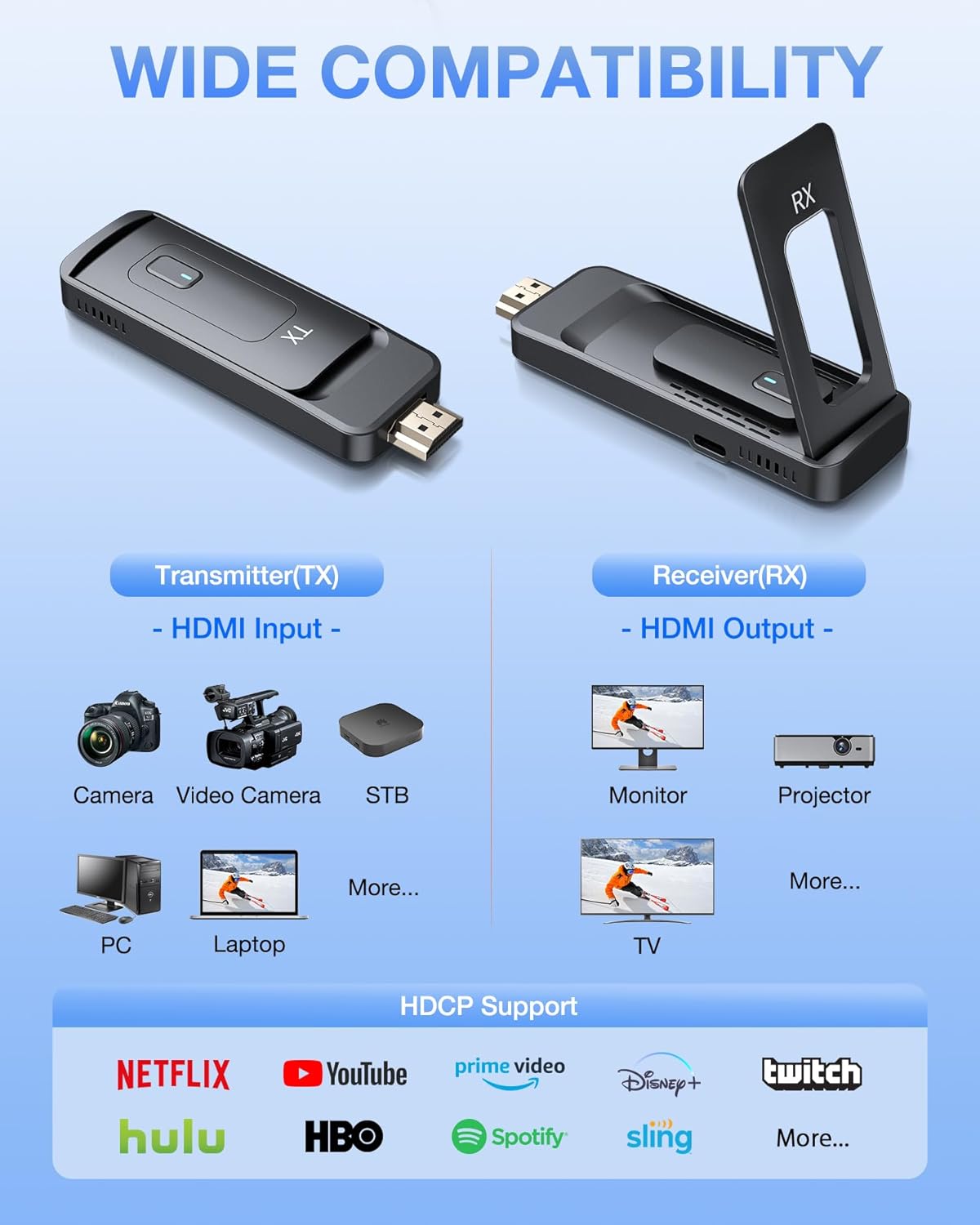 | Other Special Features of the Product | 5.8G-upgraded chip, 4K@60Hz, Up to 8 TXs, Interference-free, Powerful Antenna, Plug-and-play, Lightweight and portable, Bonus a HDMI extension cable, Dual Extend Mode, Range up to 328FT/100M, Wide compatibility, Multiple Sets, One-Year Warranty |