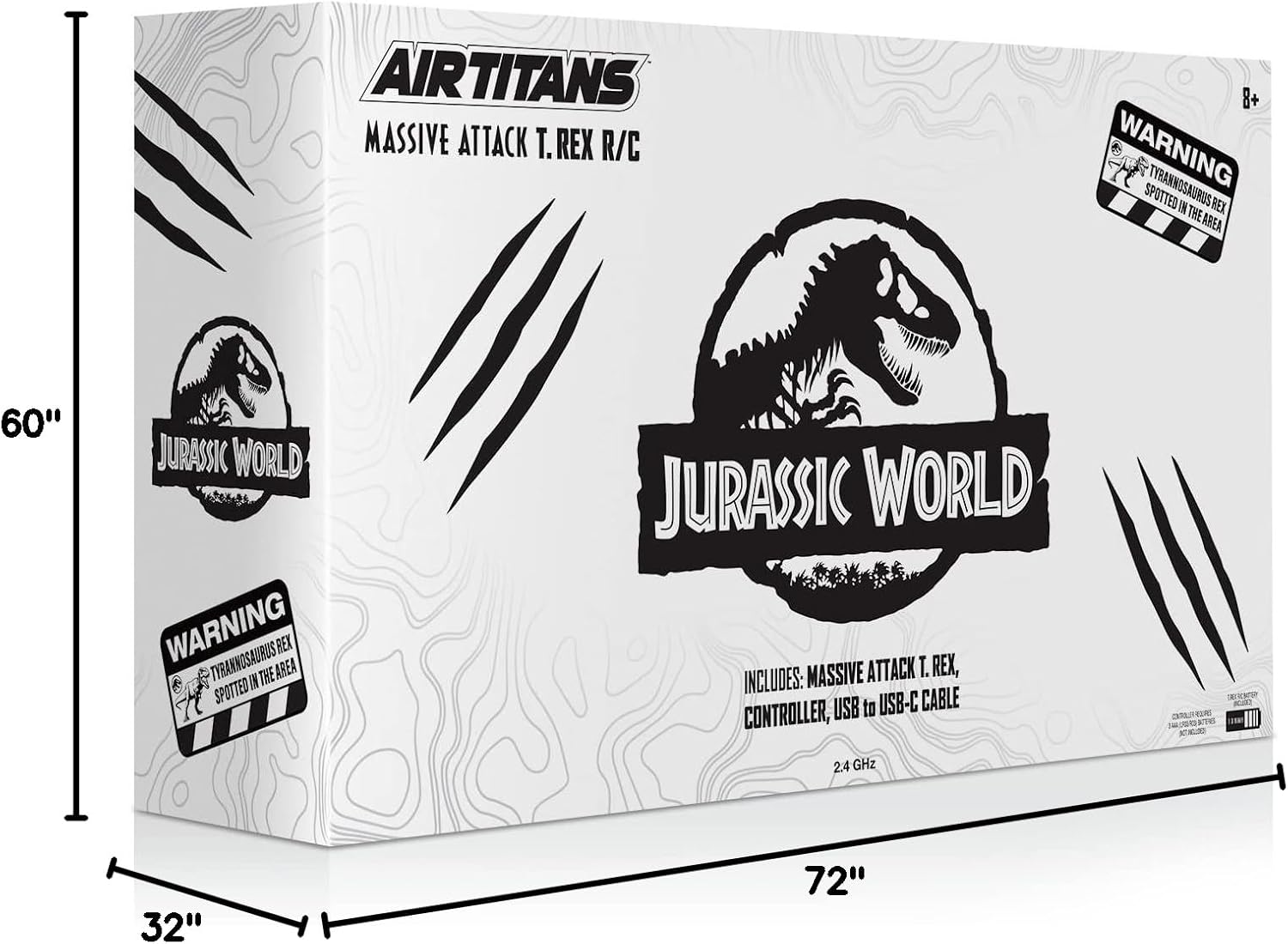 The new AirTitans Jurassic World Massive Attack T. Rex R/C is stomping its way towards you! This inflatable remote control dinosaur fully inflates in 20 seconds and is over 6 feet long! This massive T. Rex is on the move and is brought to life with over a dozen sound effects! Trigger the attack mode that temporarily gives the power back to the T. Rex to thrash and stomp its way through. Features a rechargeable battery to charge back up and roar back to life! Comes with easy storage package. Inflatable T-Rex RC comes out from the packaging box by using the controller. T-Rex RC can inflate and deflate, move forward and backward, spin and dance with the sound effects. Note: AirTitans will go into sleep mode after 2 minutes of no activity. Included: 1x Inflatable RC T-Rex and 1x Controller. Suggested for ages 8 years old and up.