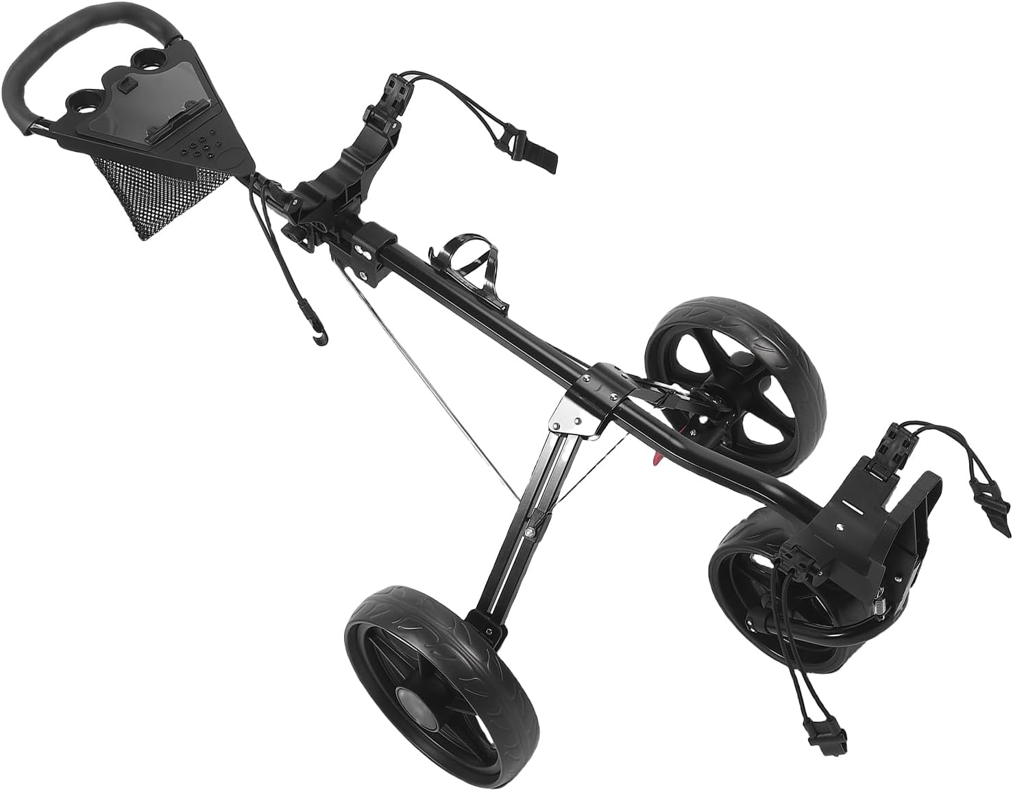 1. Quick Folding Mechanism: Featuring a foldable buckle design, this 3 wheel push cart can be collapsed with a single press, making it easy to operate and compact for storage and transport. 2. Strong Construction With Large Wheels: Crafted from premium thickened aluminum alloy and plastic, combined with large wheels, this 3 wheel folding push cart ensures durability and smoother mobility over various terrains. 3. Foot Brake System: Equipped with a convenient brake pedal, this sports push cart enables easy self braking, keeping it stationary on flat surfaces or slopes, and enhancing safety during use. 4. Adjustable Secure Bag Holder: The flexible buckle design allows adjustment according to sports bag size, ensuring a secure fit and preventing movement or falling, protecting your equipment. 5. Multifunctional Panel and Accessories: While securely holding your bag, the push cart includes a ball hole, tee slots, and cup holder, with a multifunctional panel for scorecards, ball covers, pens, and more. Specification: Item Type: 3 Wheel Folding Push Cart Material: Aluminum Alloy, Plastic How to Use: Install according to the instruction manual to use. Package List: 1 x Frame 2 x Rear Wheels 1 x Front Wheel 1 x Instruction Manual